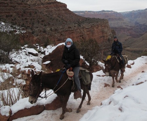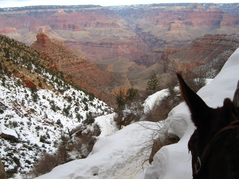 Much of my night-time thoughts since reading that comic have centered on a trip that I took to the Grand Canyon in early January 2010. It was unnaturally cold and, as a result, the two feet of snow that had fallen the week before had not yet melted. It was in the upper 20’s and, so, we bundled up in layers to start our National Park Service mule trip from the North Rim down to a small unheated cabin at the Bright Angel Creek Campground on the floor of the canyon. For the most part, we rode single-file as we descended 4,600 feet to the floor of the canyon. While riding, it was almost impossible to talk since doing so would require turning in the saddle and, given the steep descent, keeping my knees firmly planted against my mule’s belly was my priority. I remember it being so quiet and so beautiful. It was one of the most restful and reflective times of my life. We rested the mules without dismounting once in a while and, upon stopping halfway down to eat lunch, peeled off half of our layers as the day warmed. It was in the 50’s by the time we got to the campground. We spent the next two days hiking along Bright Angel Creek and then headed back up on our mules, adding layers of hats, gloves, and coats as we went.